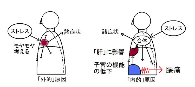 帝王切開の手術→ 子宮の機能の低下→ 「(東洋医学的な)肝」に影響をあたえ→ イライラなどの精神症状を起こす→ そこにプラスして職場でのストレスがかかる→ 余計にイライラする →諸症状を引き起こす…。