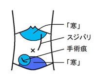とくに、心下、下焦、右下腹部の手術痕部が「寒」。