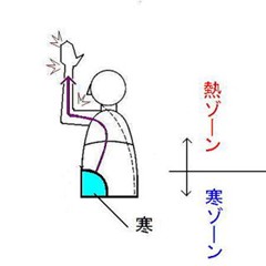 つまり、上半身(ヘソから上)に熱気が集中し、下半身に寒気が集中している状態(下図参照)なので、治療の基本は、上の「熱」を瀉し、下の「寒」を補う事となる。